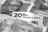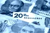 Colombian pesos money bills banknotes lies in big pile on table close up. Concept of finances and business in Colombia