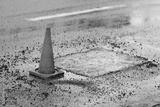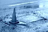 Road repair work on city road with traffic cones, laying fresh asphalt over potholes to restore the damaged roadway for safe driving. Patching potholes and laying new asphalt on deteriorated road lane