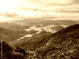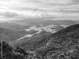 Scenic aerial view of a lake surrounded by lush green mountains under a cloudy sky