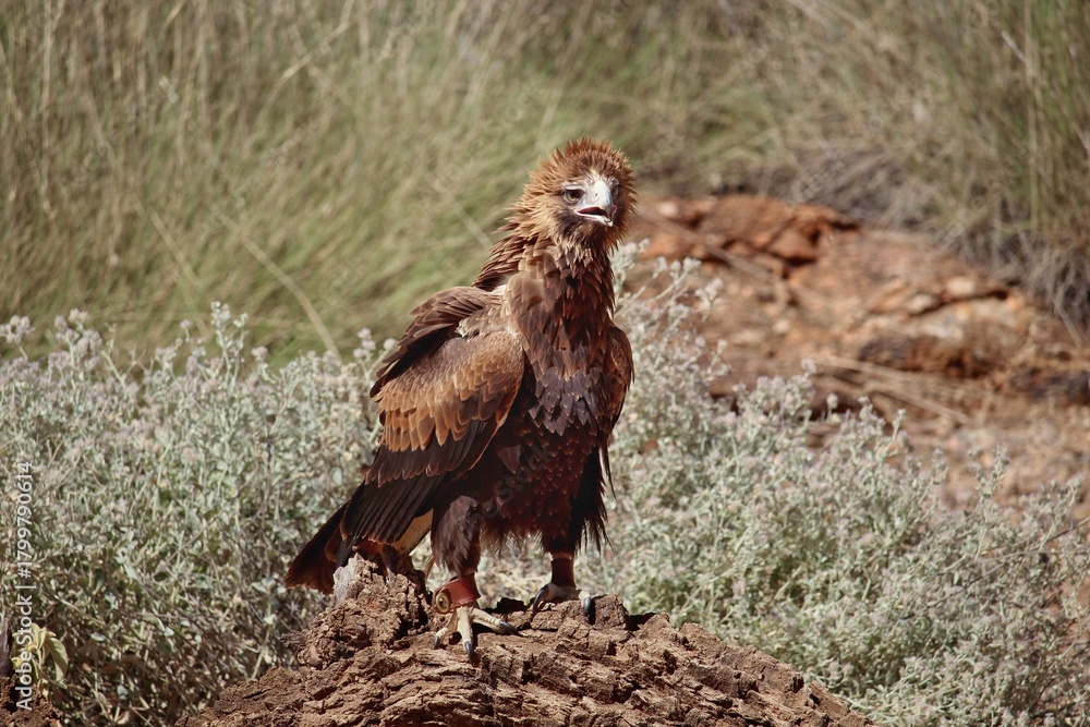 Captive Eagle Perched on Tree Stump with Jesses in Natural-Looking Habitat