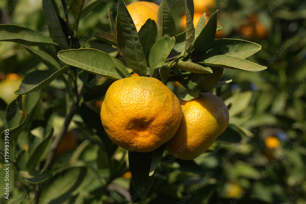Close-up of ripe tangerines on the branches of trees on a sunny day.