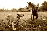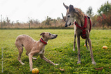 Playful whippet puppy and old Spanish galgo dog in outdoor park. Interaction between two dogs greyhound