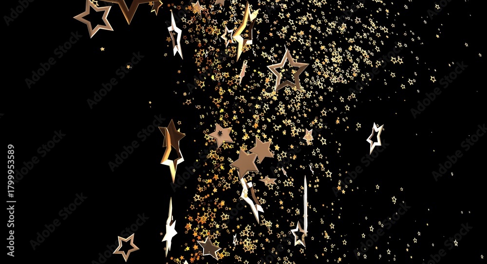 Abstract image of golden star confetti falling over a black backdrop, perfect for New Years, Christmas, and festive occasion