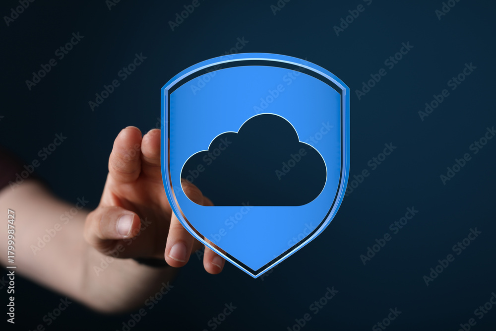 Hand holding a cloud symbol within a shield, representing secure cloud storage and data protection. Concept for