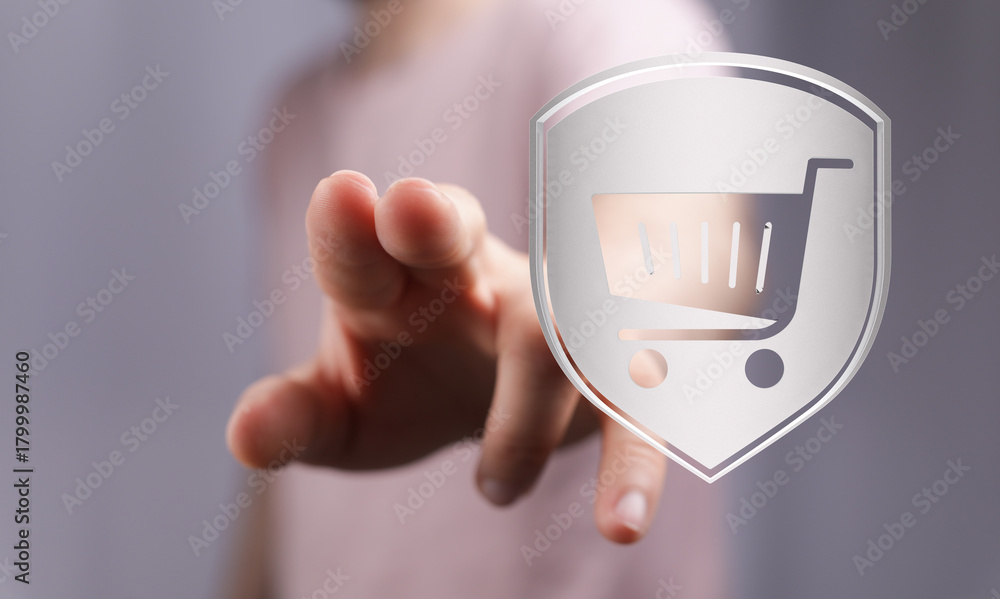 A person's finger pointing toward a shopping cart icon, representing online shopping, e-commerce, and secure transactions. Ideal for illustratin