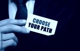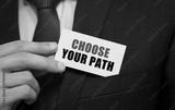 Businessman putting a card with text CHOOSE YOUR PATH in the pocket
