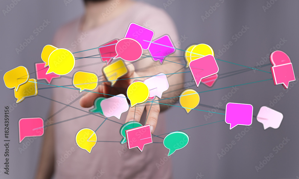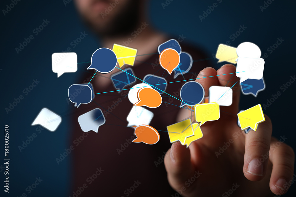 An image illustrating connection, communication, and networking through a series of speech bubbles. Perfect for