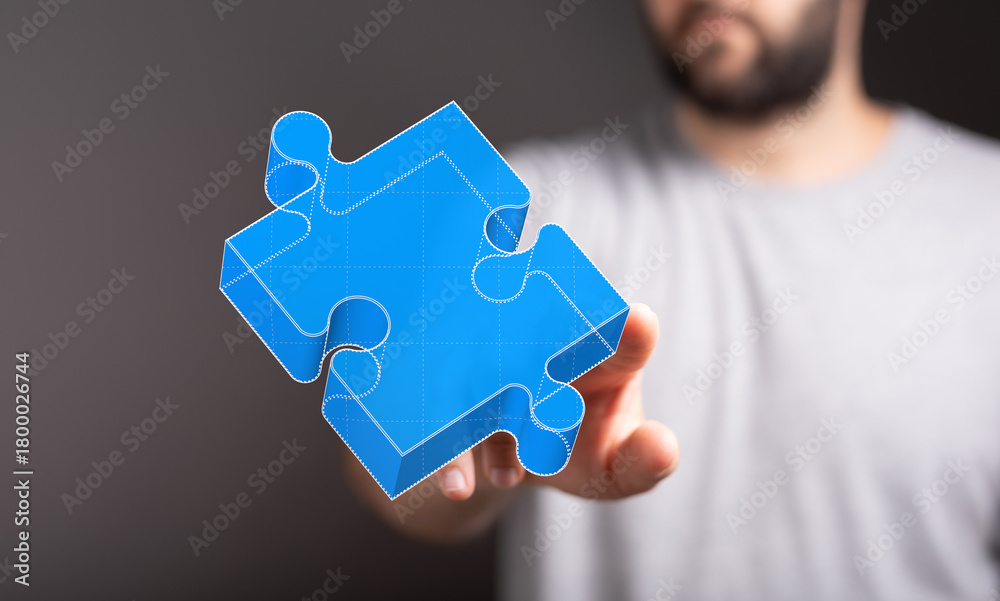 Conceptual image of a person holding a blue puzzle piece. Symbol of teamwork, problem-solving, and completion. Perfect for business and innovati