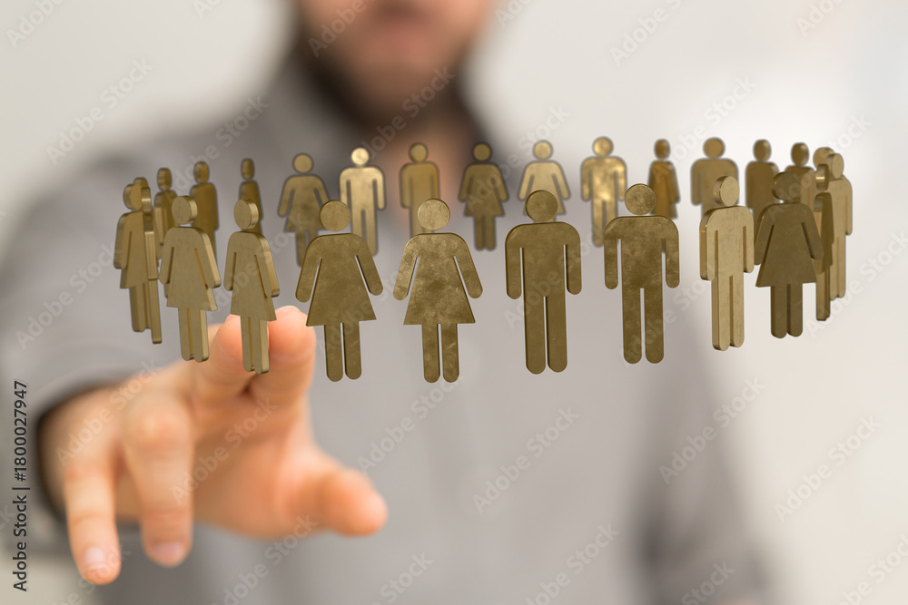Concept of digital networking, community, and global connection. A person interacts with virtual human icons, symbolizing connection and unity i