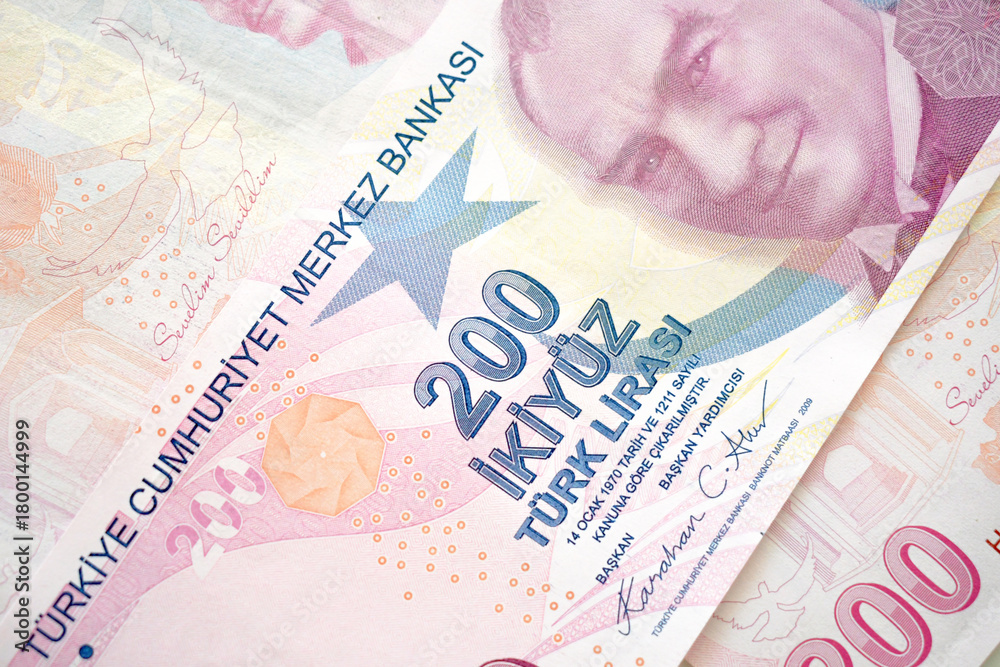 200 Turkish lira banknotes on the table. Business and finance concept.