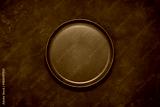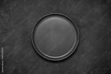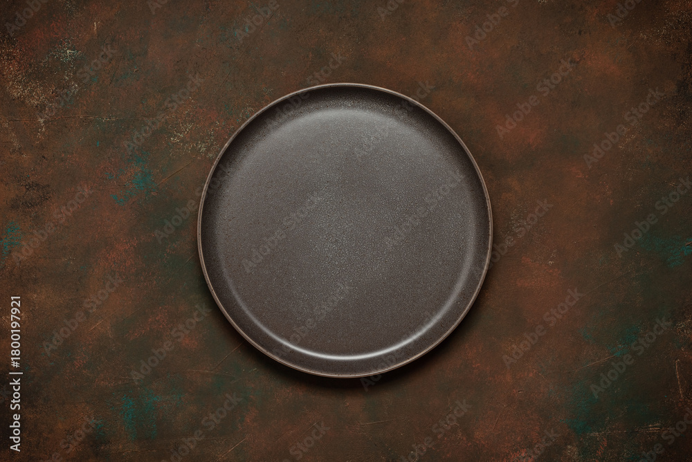 Empty brown plate on dark brown grunge background, top view, flat lay.