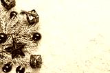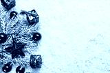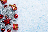 Festive Christmas composition with red ornaments, shiny gift boxes, and a decorative star placed on frosted pine branches against a bright snowy background