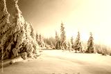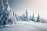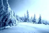 Charming snow-covered pine trees blanketed in fluffy white snow after a heavy snowfall. Merry Christmas and Happy new year.