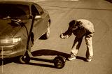 Woman examines and photographs the damage caused by a collision between an electric scooter and a car.