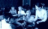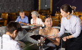Interested positive young girl and guy sitting at table in restaurant, holding menu and talking to polite waitress about dishes choice