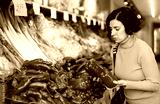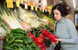 Adult woman buyer choosing fresh bell peppers in vegetable shop