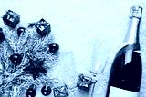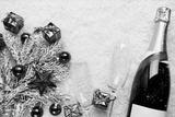 Christmas and New Year celebration scene featuring a bottle of champagne, two empty champagne glasses, red holiday ornaments, frosted pine branches and small gift boxes arranged on a snowy background.