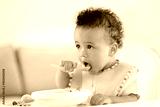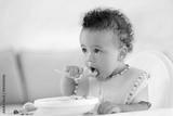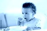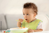 Little baby eating fruit puree indoors