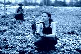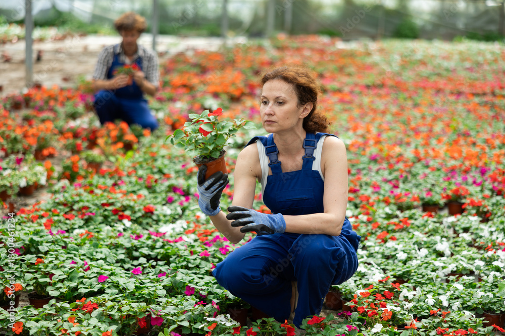 Attentive garden shop worker in casual blue overall diligently tends to flowers of the Balsaminaceae genus, surrounded by a variety of potted plants