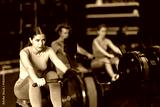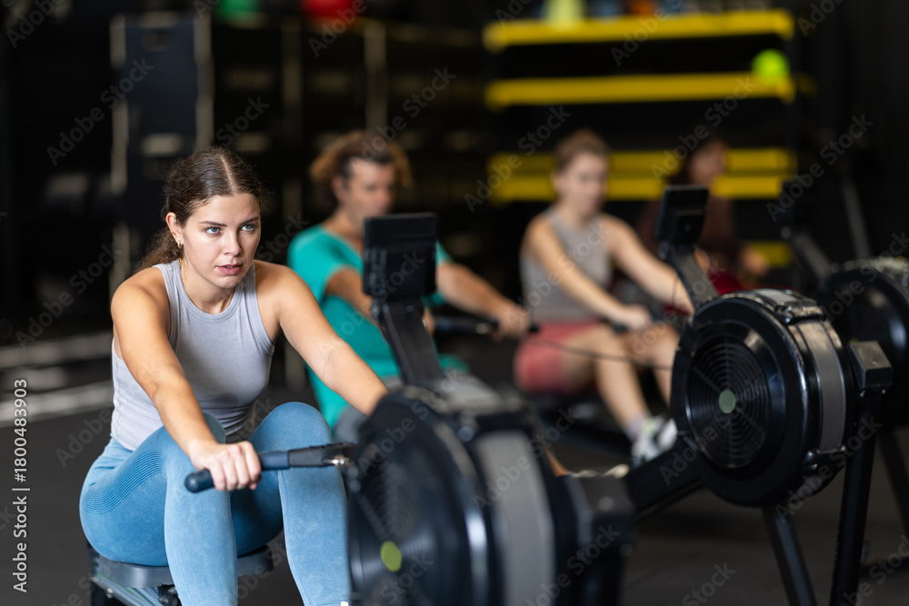 Sportive young girl training with rowing machine in sports hall during crossfit workout