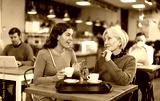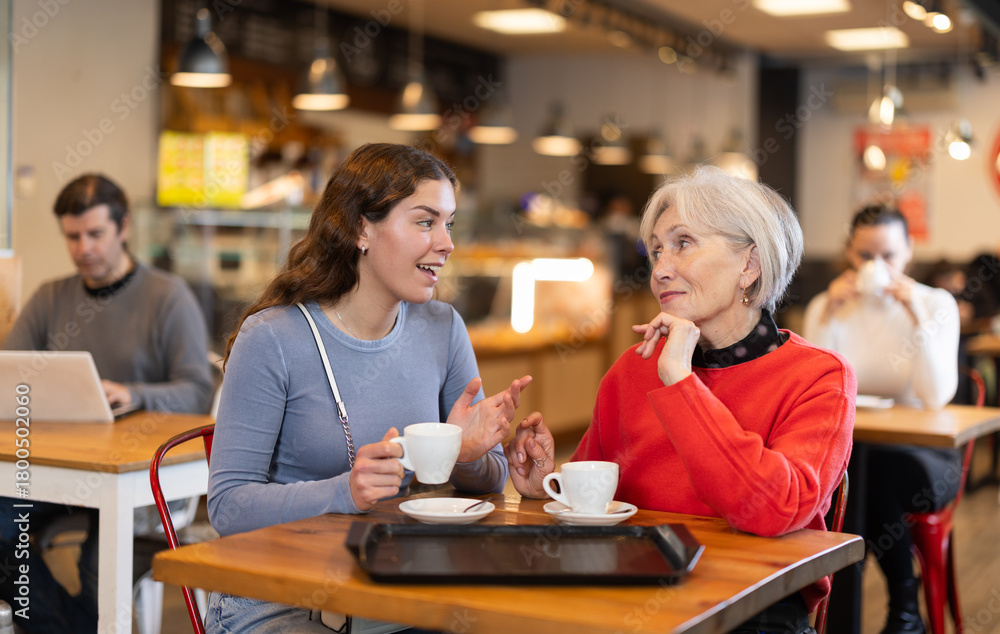 During lunch break, mature female at cafe drinking coffee, talks with granddaughter, spends time in company of friend. Meeting on neutral territory, discussing personal and business issues