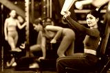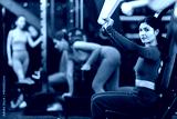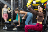 Latin woman performs a shoulder press while sitting in a machine against the background of women training in the gym. Woman pays attention to the deltoid muscles and does strength exercises