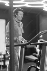 Man exercising on a treadmill in the Crossfit gym. Adult man trains for a sculpted body and muscle strength