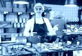 Portrait of positive saleswoman in a cafe offering to buy fresh pastries