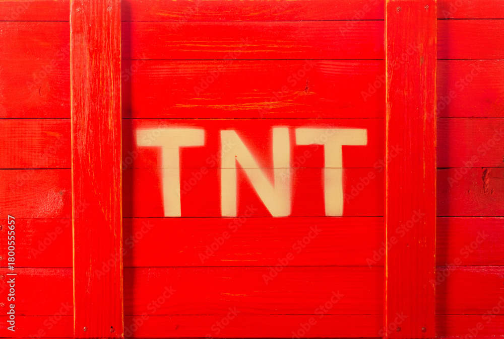 Photo of red painted wooden dynamite box panel with tnt insignia.