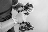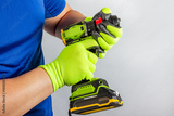 Photo of a male worker hands in protective green gloves holding cordless screwdriver on gray background.