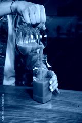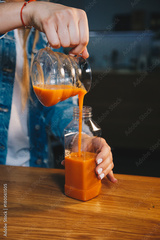 Woman hand filling plastic bottle with fresh carrot juice on the wooden table in the kitchen. Close up