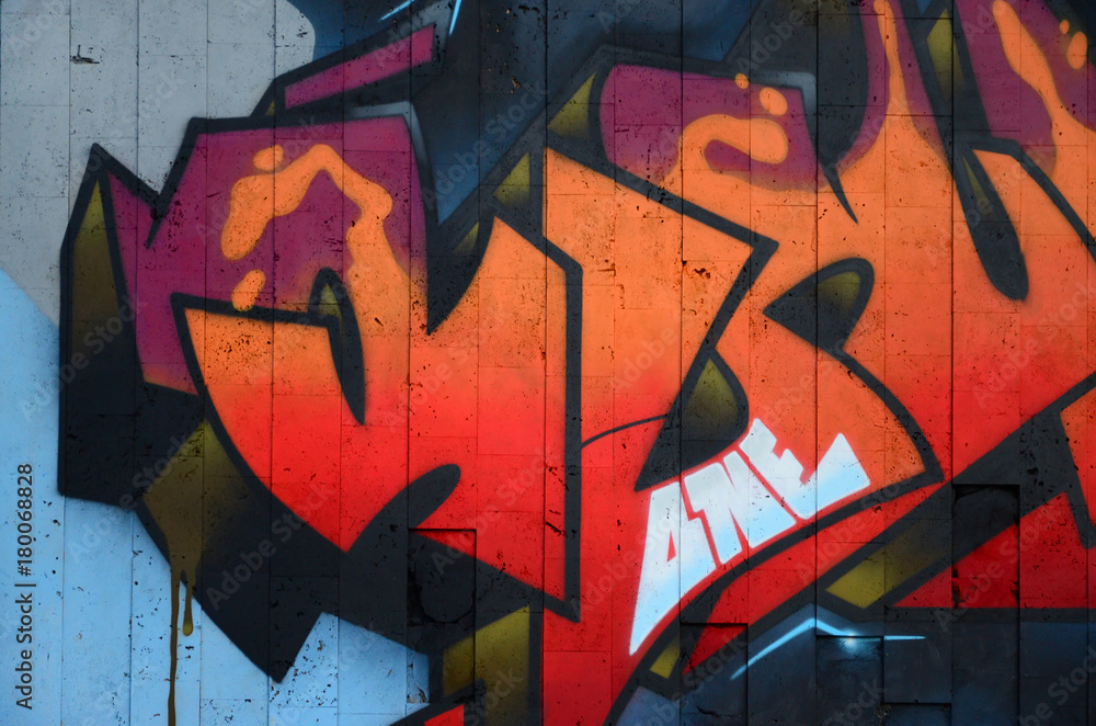 A fragment of detailed graffiti of a drawing made with aerosol paints on a wall of concrete tiles. Background image of street art in warm red color tones