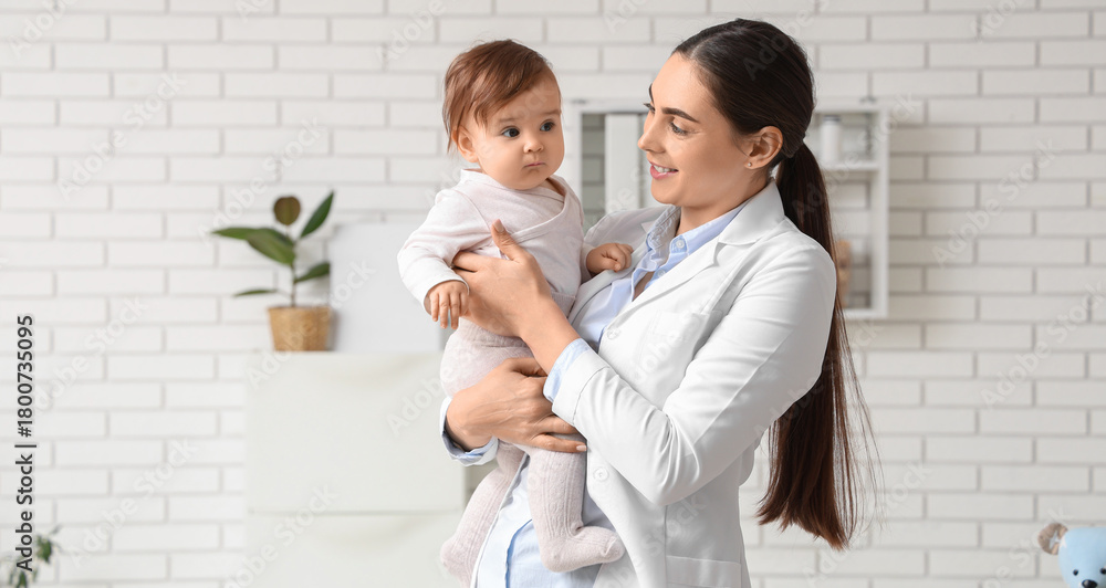 Young female pediatrician with cute little baby in clinic