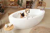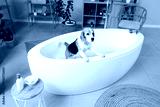 Cute Beagle dog taking bath with soap foam and bottle of shower gel at home