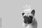 Cute French bulldog with headband in shape of Birthday cake on lilac background