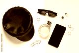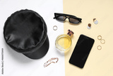 Stylish accessories with mobile phone, perfume and sunglasses on colorful background. Top view