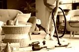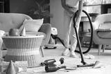 Young woman using vacuum cleaner in messy room after Birthday party