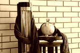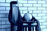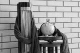 Piggy bank with money, warm scarf and electric heater near brick wall. Heating saving concept