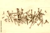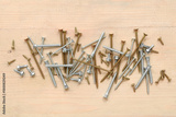 Different screws on wooden background
