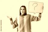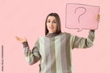 Young woman holding speech bubble with question mark on pink background
