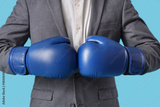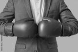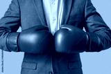 Young businessman with boxing gloves on blue background, closeup. Knockout concept