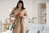 Young woman buttoning up beige trench coat at home