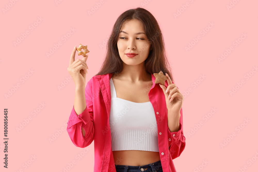 Thoughtful young Asian woman with star shaped cookies on pink background
