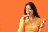 Young Asian woman eating cookies on orange background