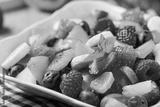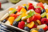 Delicious fruit salad with fresh fruit. Wooden, gray table in the background.