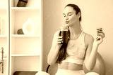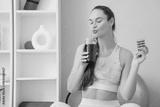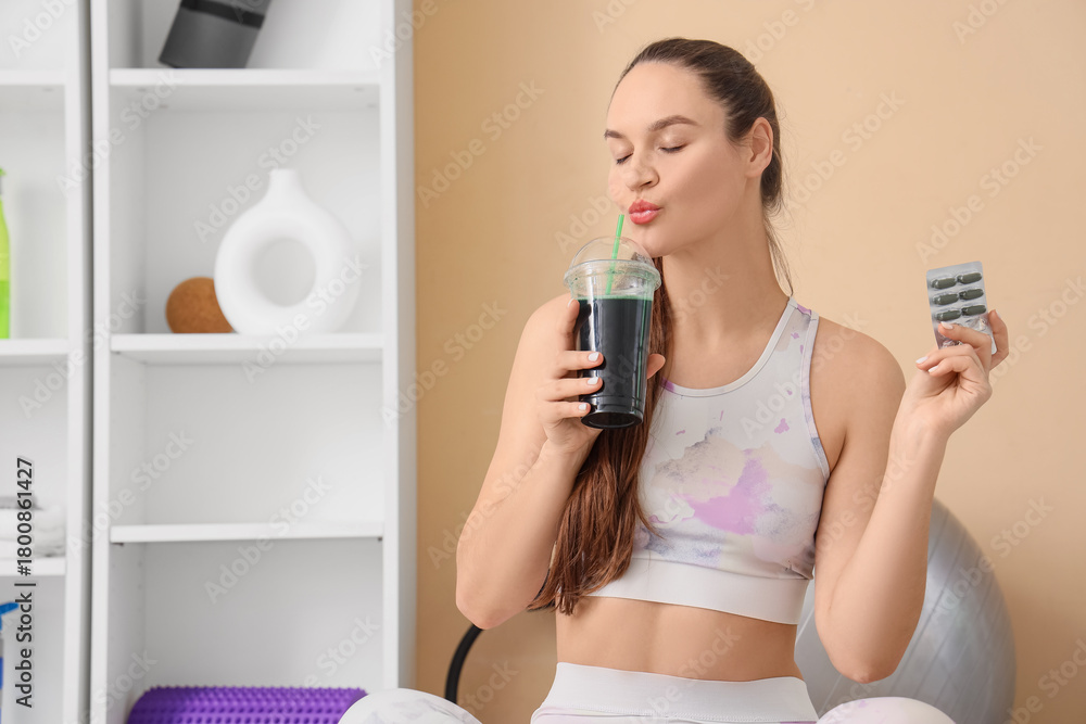 Sporty young woman with spirulina capsules drinking smoothie at gym
