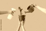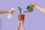 Female hands with plant, watering can and spray bottle on lilac background