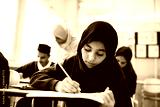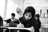 diverse muslim children studying in classroom