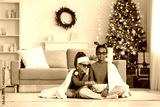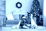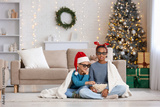 Cute children in 3D glasses with plaid and popcorn watching cartoons at home on Christmas eve