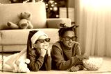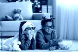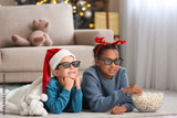 Cute children in 3D glasses with plaid and popcorn watching cartoons at home on Christmas eve